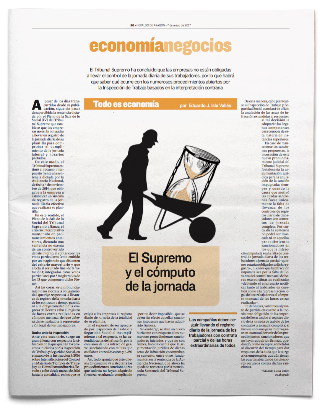 El pasado 7 de mayo de 2017, se publicó en el diario Heraldo de Aragón el artículo de opinión de Eduardo Isla, en relación a la Sentencia dictada por el Tribunal Supremo que ha concluido que las empresas no están obligadas a llevar el control de la jornada diaria de sus trabajadores de jornada completa.